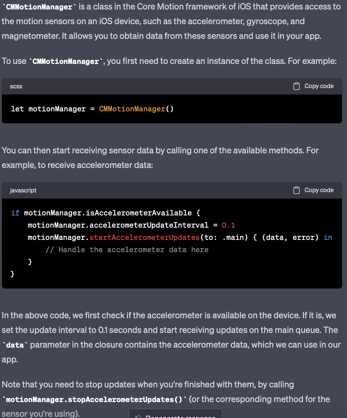 CoreMotion 프레임워크에 있는 것으로서 ios기기 모션센서에 접근할수 있게 해준다. 가속도계가 사용가능한지 확인하구 가능하면 업데이트 간격을 0.1초로 잡고 메인큐에서 업데이트 받는다. data에 가속도계 데이터 포함. 업데이트 사용 끝나면 중지해야함.