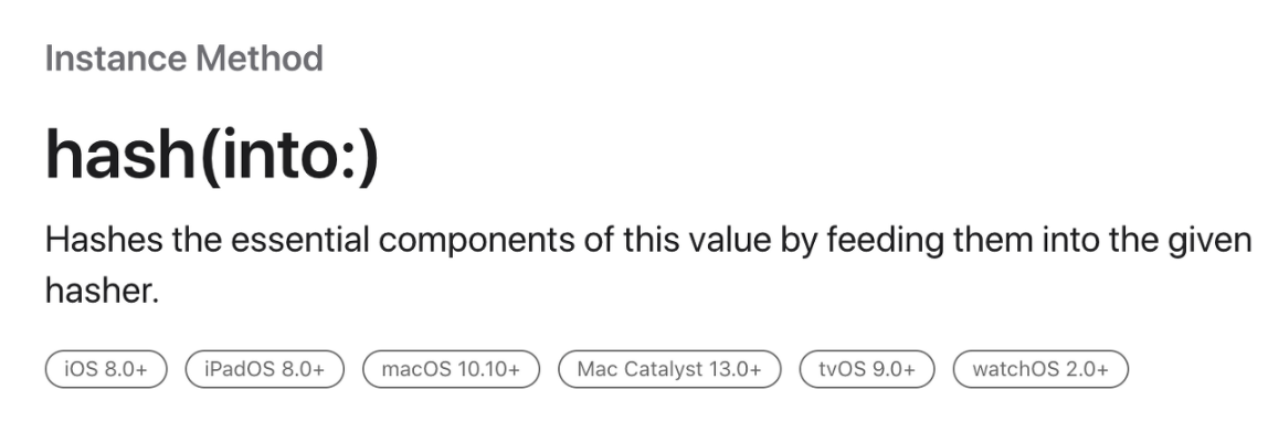 hashable 프로토콜을 채택하면 구현해야 하는 필수 메서드다. 요소들의 값을 주어진 hasher에 전달해서 해싱하는 함수.