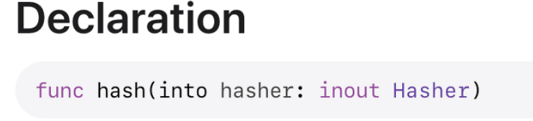 hashable 프로토콜을 채택하면 구현해야 하는 필수 메서드다. 요소들의 값을 주어진 hasher에 전달해서 해싱하는 함수.