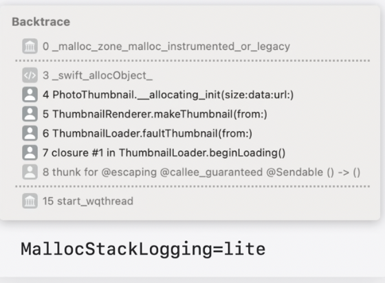 Malloc Stack Logging을 사용했기 때문에 각 할당의 역추적 정보도 포함되어 있었습니다.