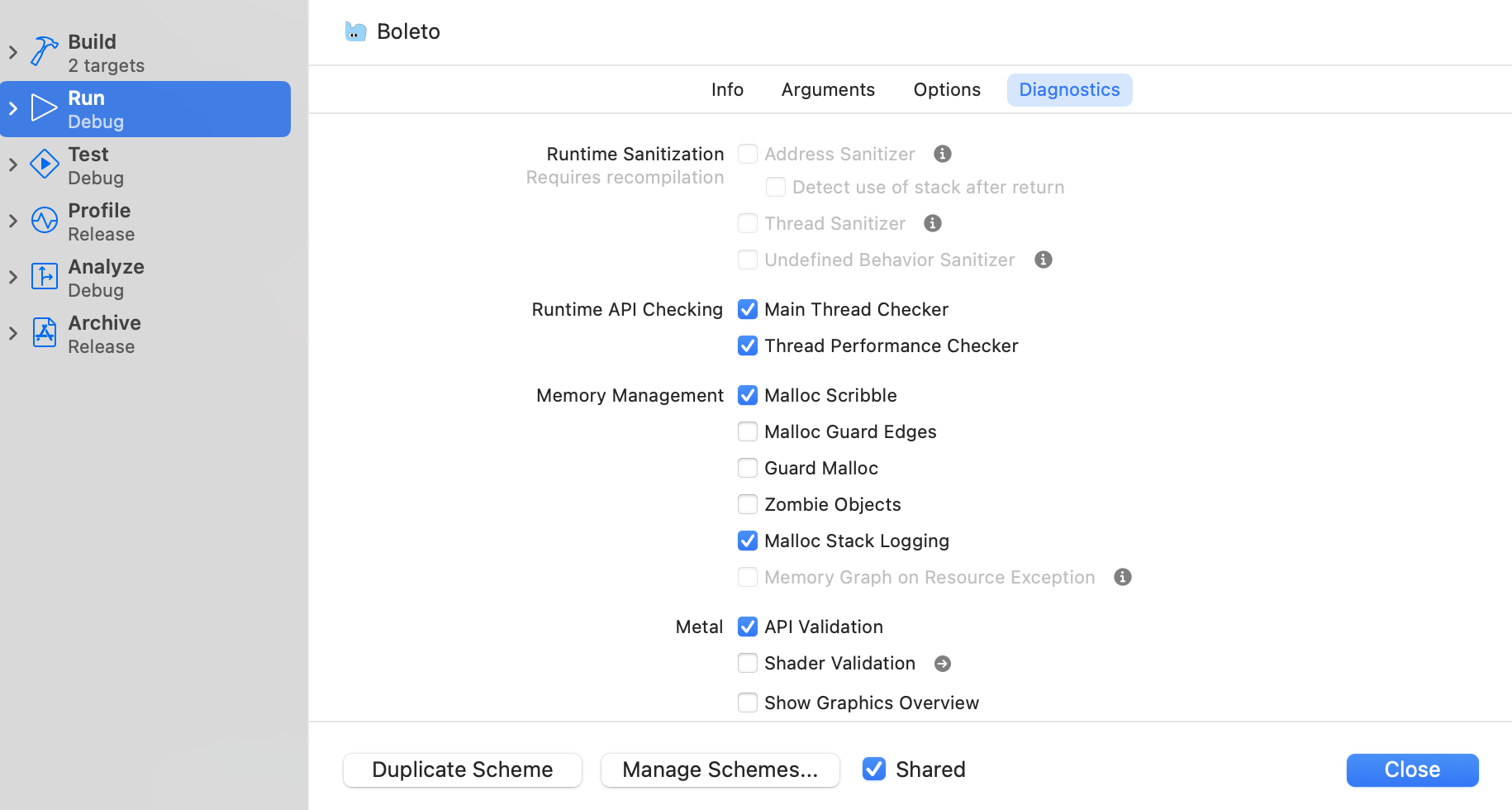 먼저 Edit Scheme에서 두 가지 중요한 옵션을 활성화했습니다: