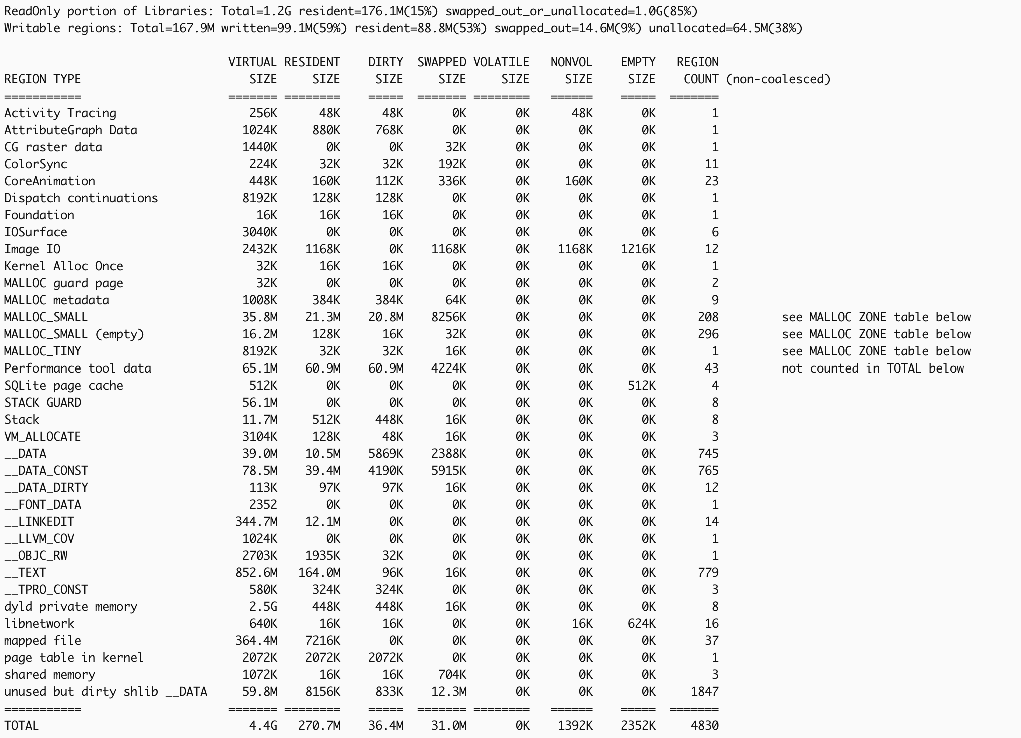 vmmap --summary 해당이름.memgraph