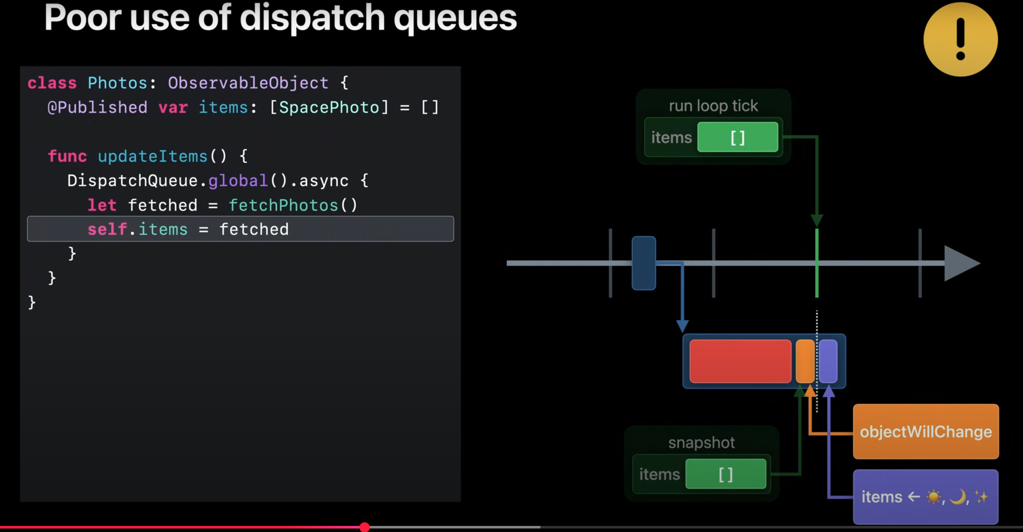 - objectWillChange 시점 문제 - 스냅샷을 찍었지만 다음 Run Loop tick과 비교했을 때 아직 차이가 없음