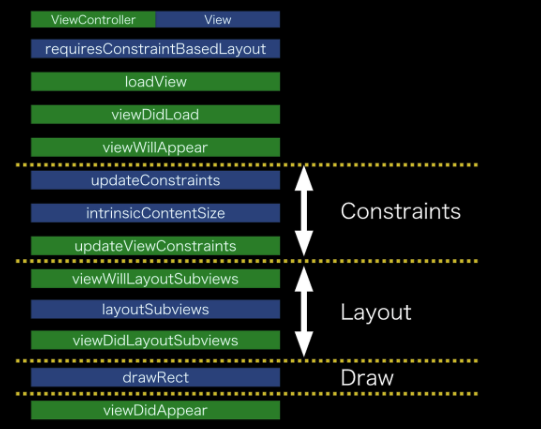 즉, 제약조건 업데이트는 제약조건이 변경되었을때만 선택적으로 호출되고, Draw단계는 커스텀 드로잉이 필요한 경우(setNeedsDisplay 호출시)에만 실행된다.