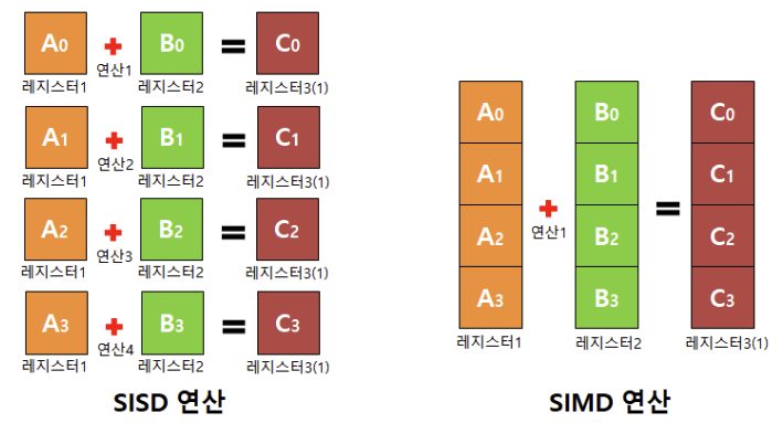 - 작동 방식: 하나의 명령어가 여러 데이터 요소에 동시 적용