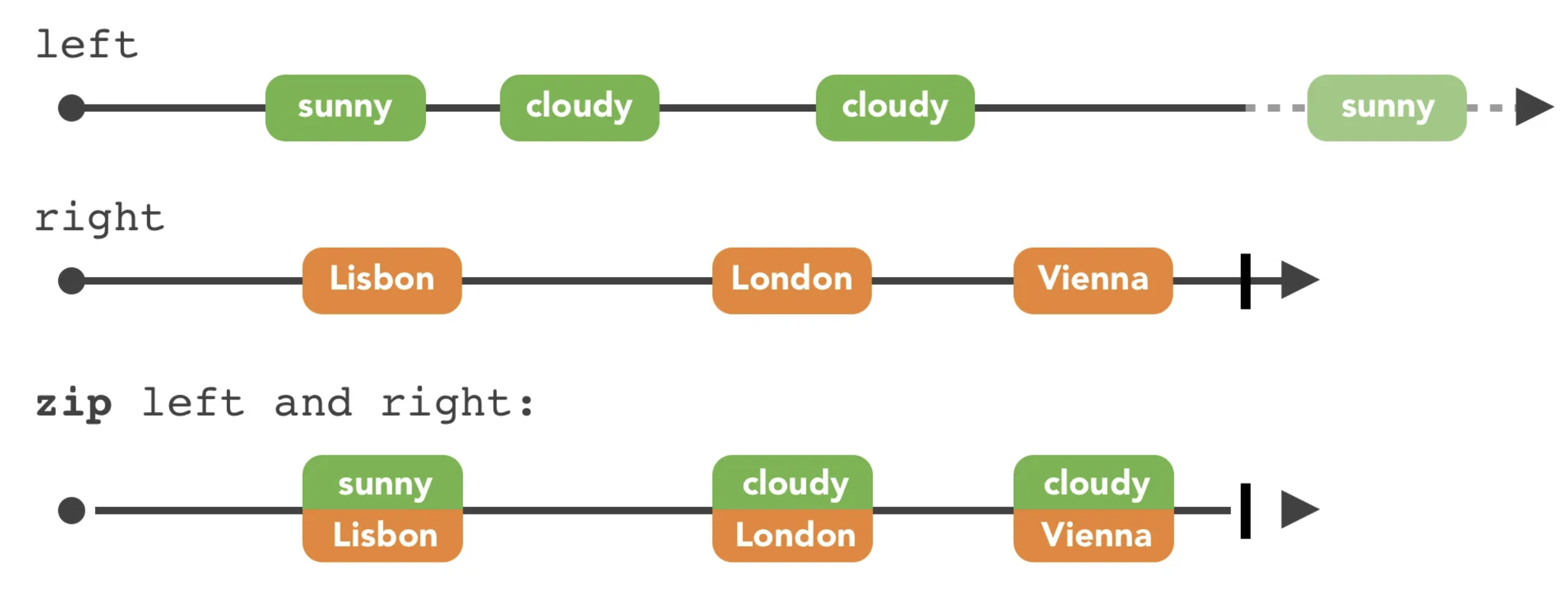 - 완료 조건: 어느 하나의 Observable이 완료되면 전체 시퀀스도 완료됨