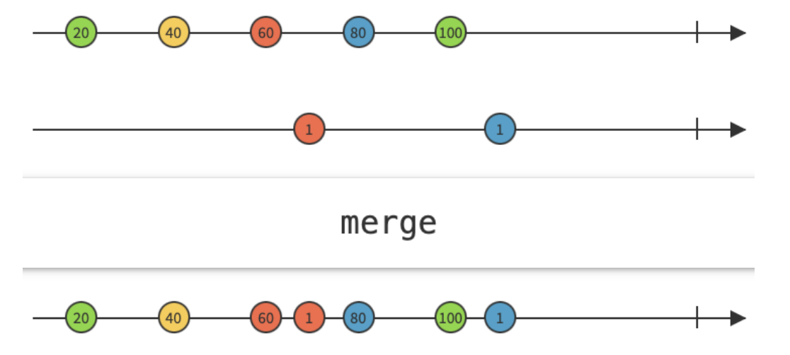 여러 observable 이벤트를 소스 구분 없이 하나의 Observable로 결합합니다. 순서가 없는것! 그냥 흐름상 맞게 합쳐줍니다