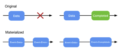 materialize는 Observable의 이벤트를 Event<T>로 변환하여 에러를 포함한 모든 이벤트를 다른 Observable로 처리할 수 있게 합니다. 이를 통해 에러 처리를 더 세밀하게 제어할 수 있습니다. dematerialize는 반대로 Event<T>를 원래의 Observable로 되돌립니다.