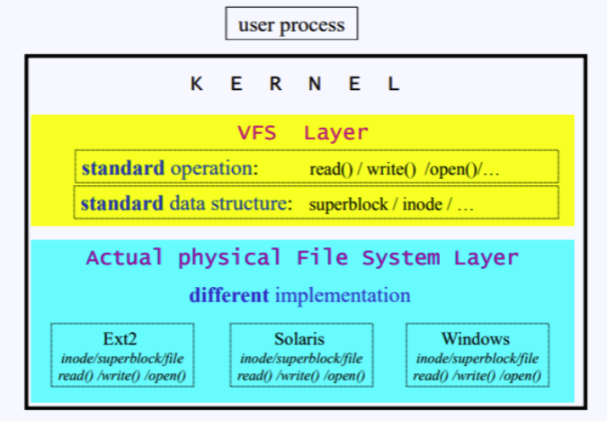 VFS 덕분에 ext4, NTFS, FAT32, NFS 심지어 윈도우나 Solaris 파일 시스템까지도 마치 하나의 일관된 방식으로 접근할 수 있게 되었어요.