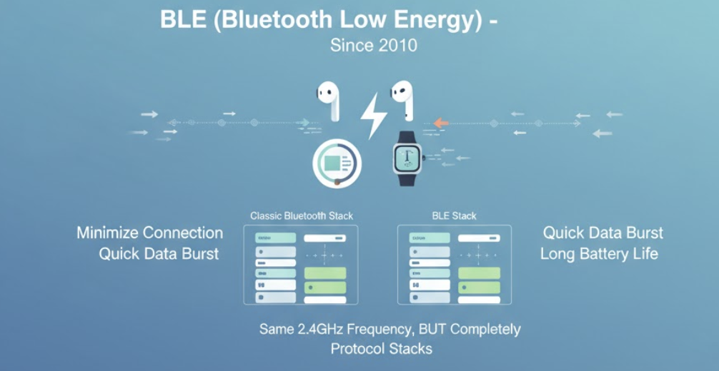 이를 위해 BLE는 클래식 블루투스와 완전히 다른 프로토콜을 새로 만들었습니다. 같은 2.4GHz 주파수를 쓸 뿐, 내부 구조는 별개예요.