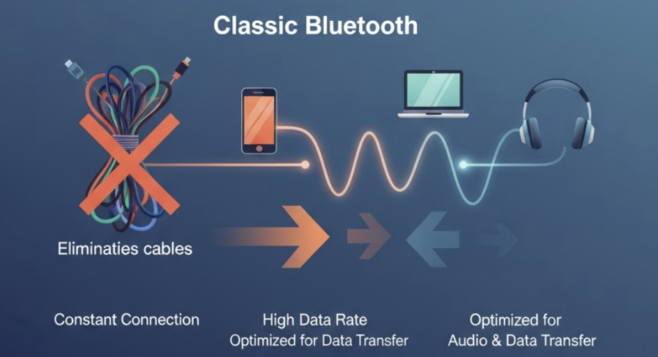 초기 블루투스는 "케이블을 없애자"라는 목표로 탄생했습니다. 지속적인 연결과 높은 데이터 전송률에 최적화됐죠.