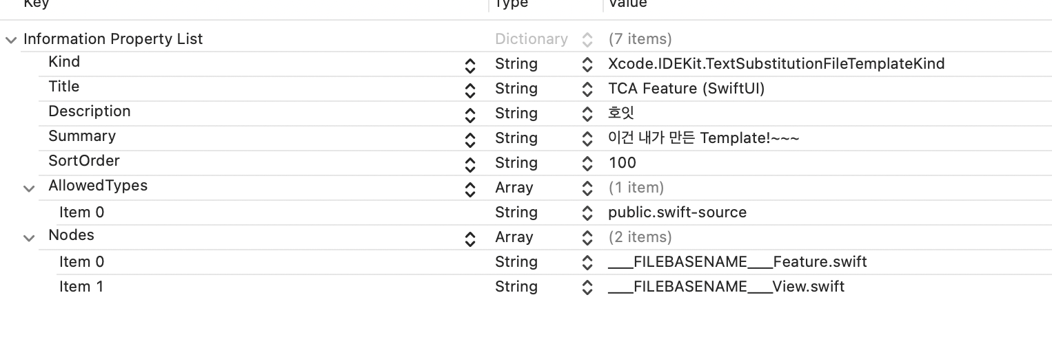 모든 .xctemplate 폴더 안에는 TemplateInfo.plist가 반드시 있어야 해요.