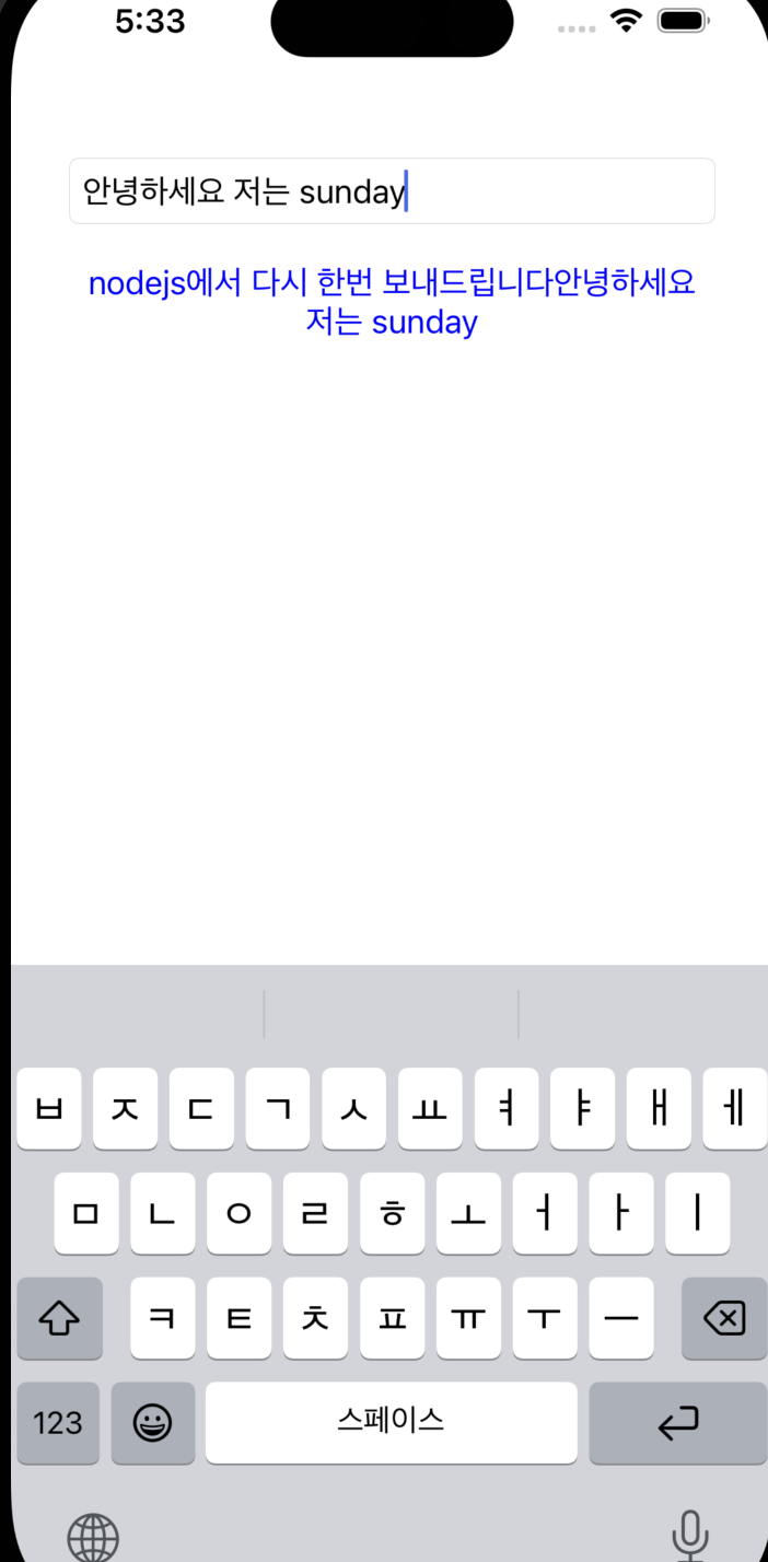 처음에 messageLabel에는 아무것도 없다. textfield에 값을 입력하고 엔터를 누르게 되면 sendmessage가 호출되고 server에게 보내게 된다. 그 후 서버에서부터 message가 오면. setupSocketEventhandeler 로 부터 메시지를 맏고 updateMessageLabel로 부터 서버로 부터 온 데이터를 messageLabel에 출력해주게 된다.