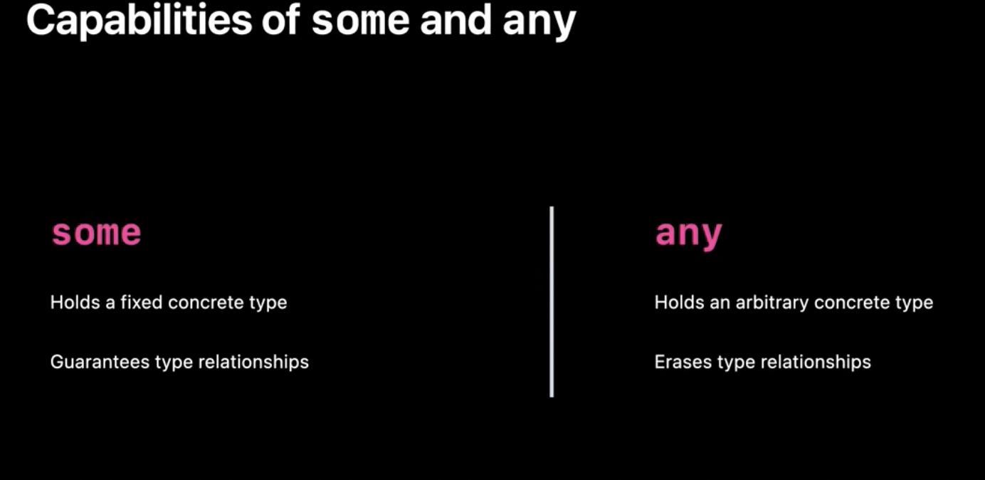 Apple은 컴파일 타임에 정해지는 some을 일반적으로 사용하고, 진짜 필요할 때만 Any를 사용하는 것을 권장해요. 그 이유는 런타임 때 정해지기 때문에 예측 가능성이 떨어지기 때문이죠.