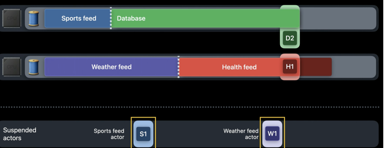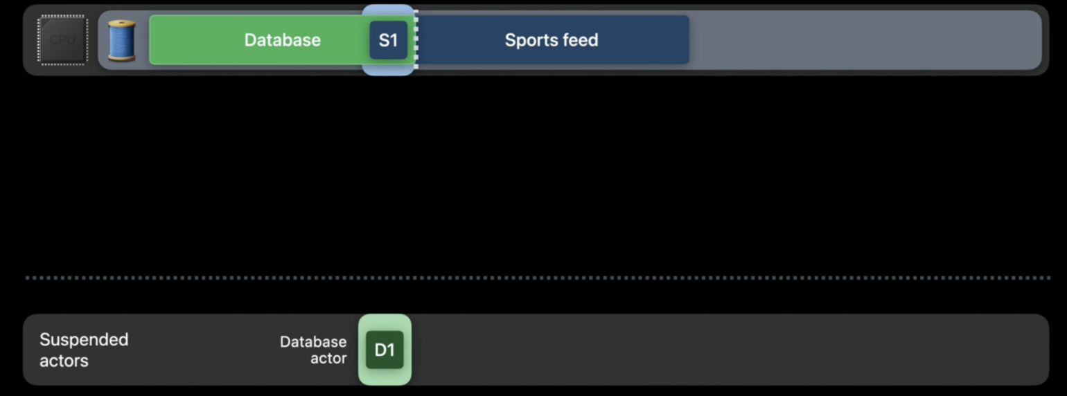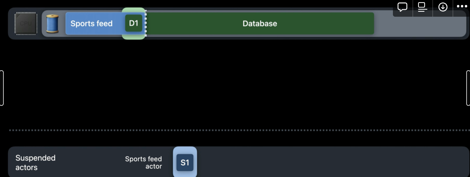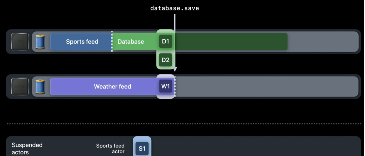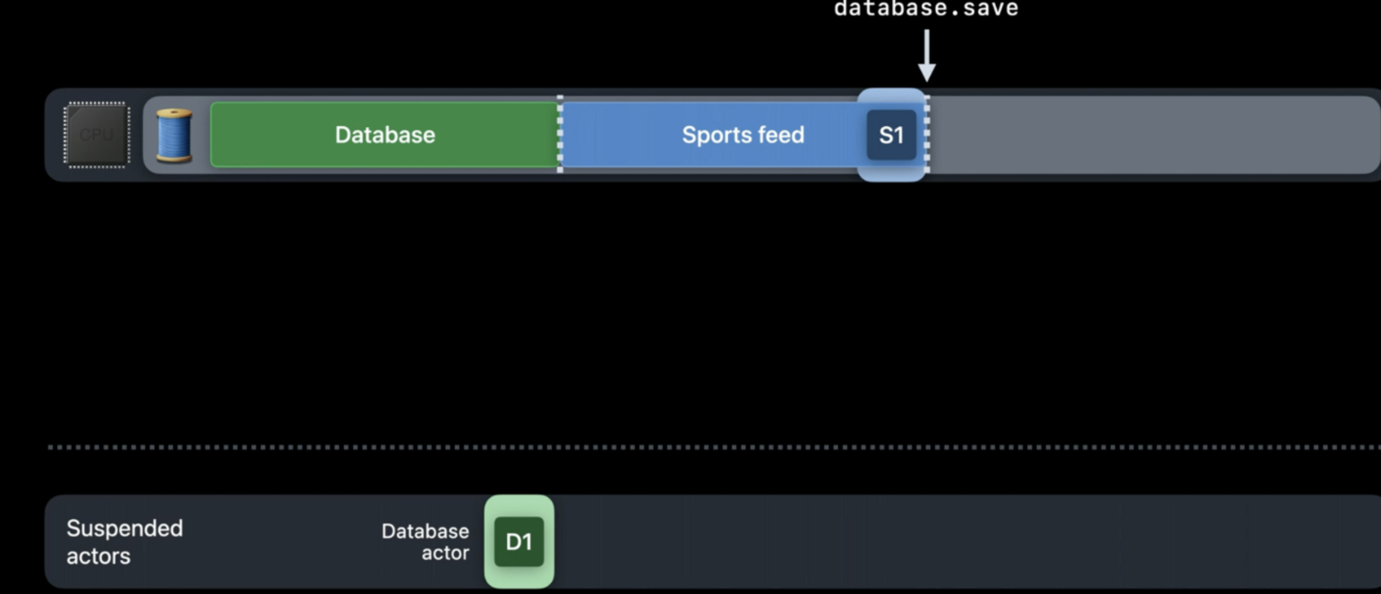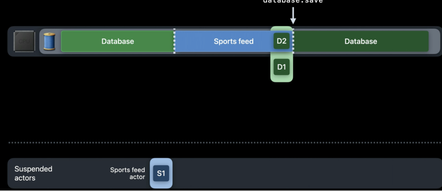 - D1 = Database actor에서 어떤 작업에 대해 await를 하면서 이 database actor는 suspend!!!