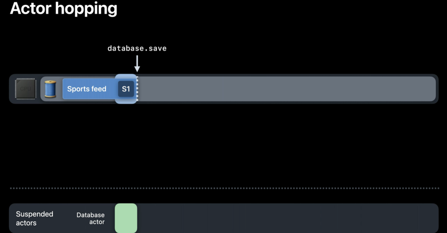 코드에서 fetchAndSave()가 실행되면 await database.save(data: data)에서 suspend되면서 FeedActor → DatabaseActor로 Actor Hopping이 발생한다. 스레드가 다른 Actor에 대한 작업을 시작하기 위해 한 Actor에 대한 작업을 일시 중지할 때 ⇒ Actor Hopping