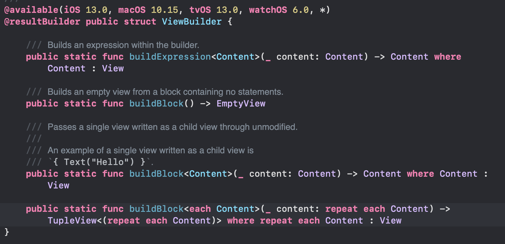 public static func buildBlock<each Content>(_ content: repeat each Content) -> TupleView<(repeat each Content)> where repeat each Content : View