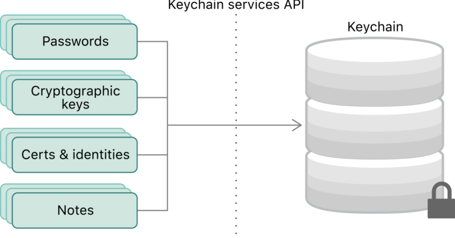 keychain은 하나의 암호화된 컨테이너로 디바이스 내에서 안전하게 데이터에 보호하며 샌드박스 밖에 위치해 앱 삭제에도 영향을 받지 않는다.