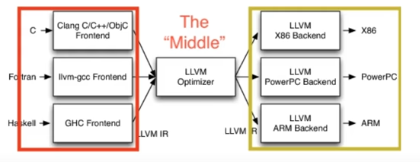 프론트엔드 → LLVM IR → 백엔드