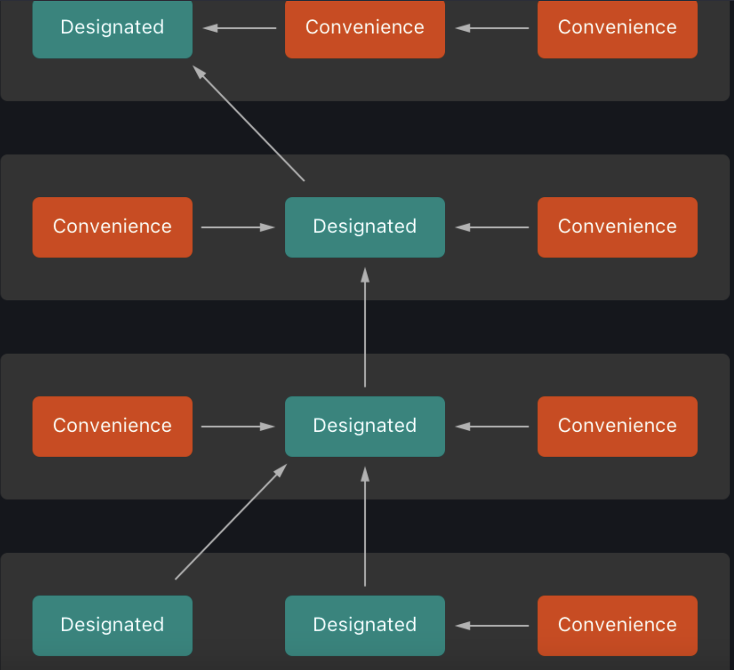 2. 하위클래스가 규칙 1에 따라 상속하거나 정의의 부분으로 사용자 정의구현을 제공하여 모든 상위클래스 지정된 초기화구문의 구현을 제공하면 모든 상위 클래스 편의 초기화 구문을 자동으로 상속!
