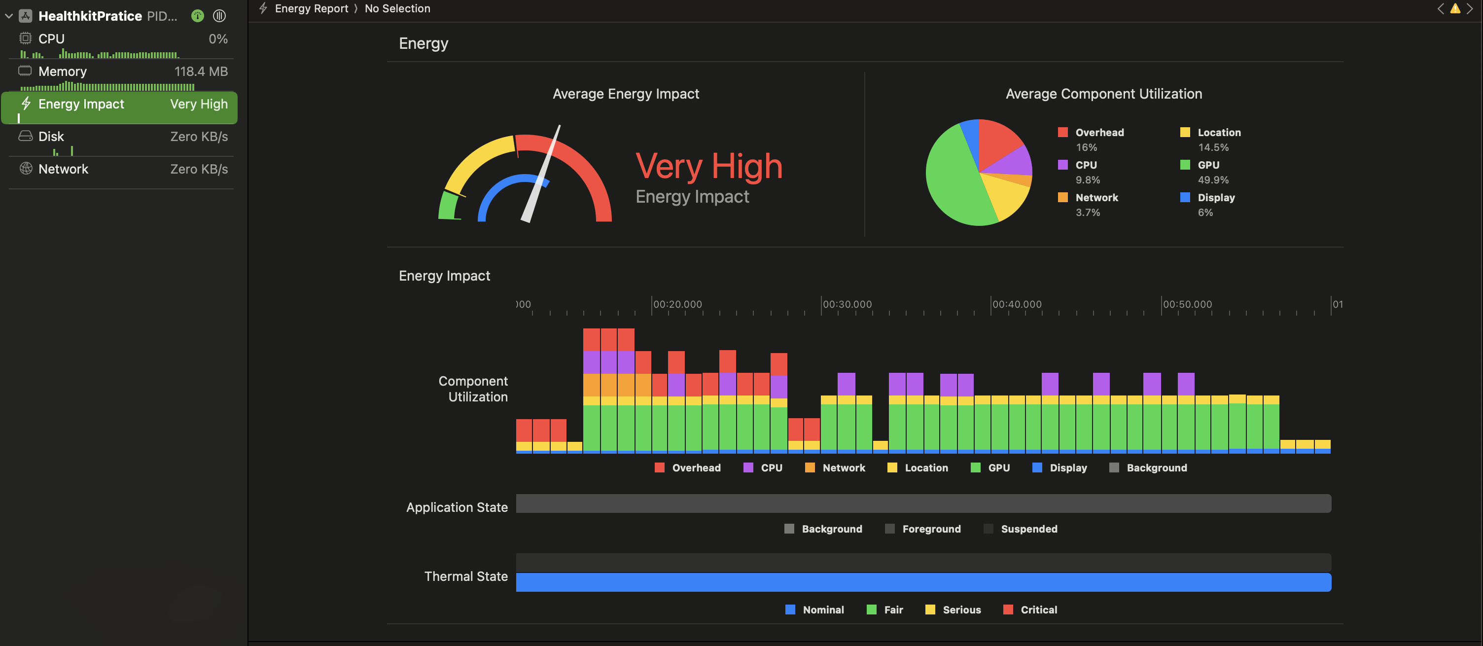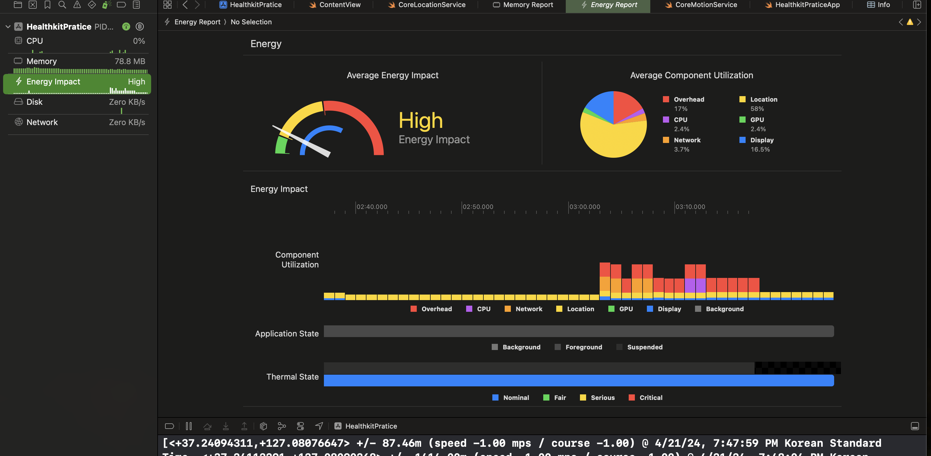 를 이용하면 xcode내에서 CPU, Network, 위치 사용량 등 시스템 사용량에 대한 정보를 제공한다. 또한 시간대로 위치사용이 앱에 미치는 영향을 보여준다. 그래서 내가 궁금했던 corelocationManager를 어떻게 관리해야 enegery를 가장 아끼고 우리가 원하는대로 사용할 수 있을지 지금부터 체크해보겠습니다.