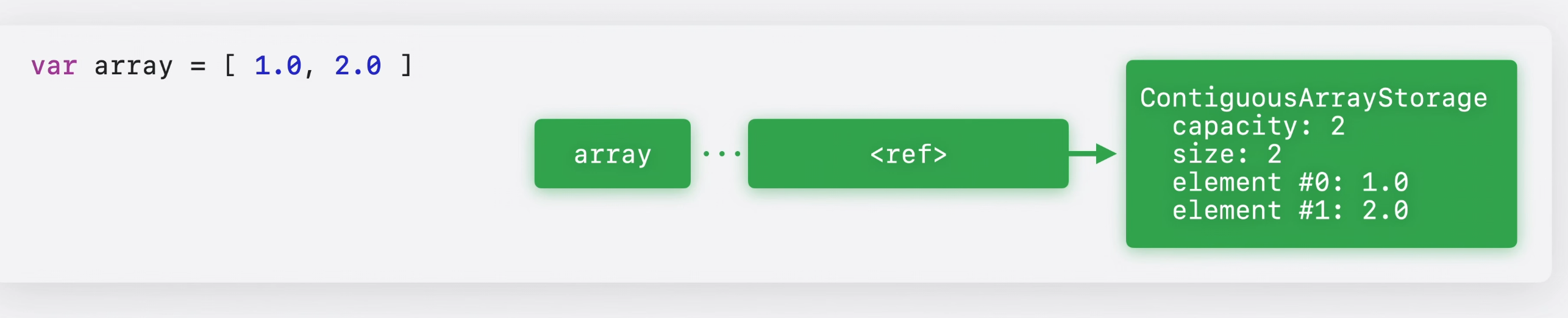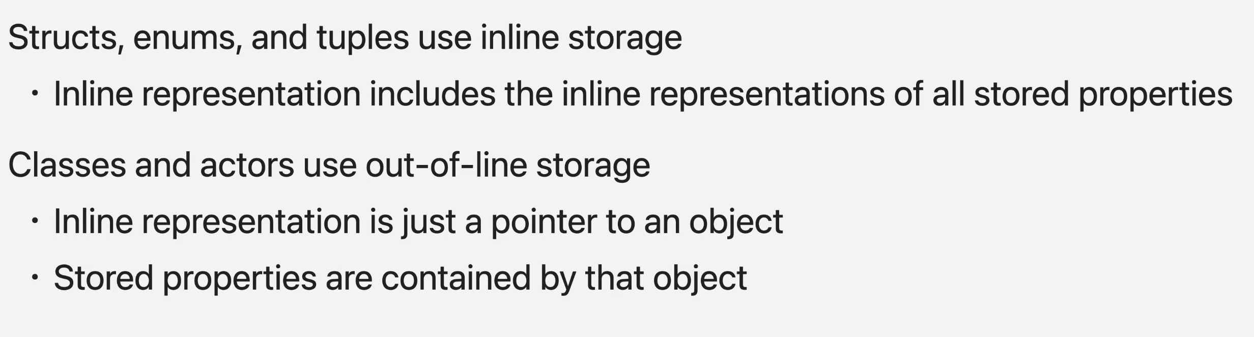 - 구조체 값 복사: 모든 저장 속성을 재귀적으로 복사하므로 큰 구조체는 비용이 많이 들 수 있습니다.