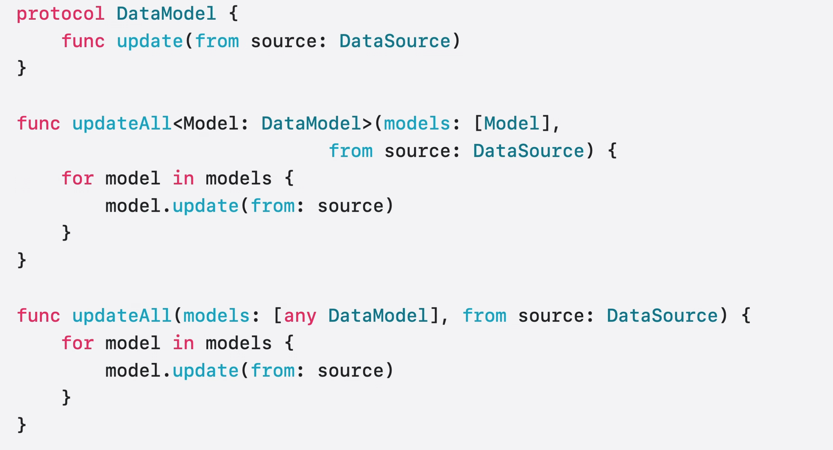 첫번째꺼는 동일한 모델이 array에 들어간다. 타입에 대한 정보는 함수에게 한번만 전달된다.