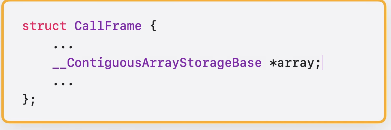 CallFrame에는 로컬 범위에 포함된 배열 값이 있고, 이는 CallFrame의 inline 표현에 배치됩니다.