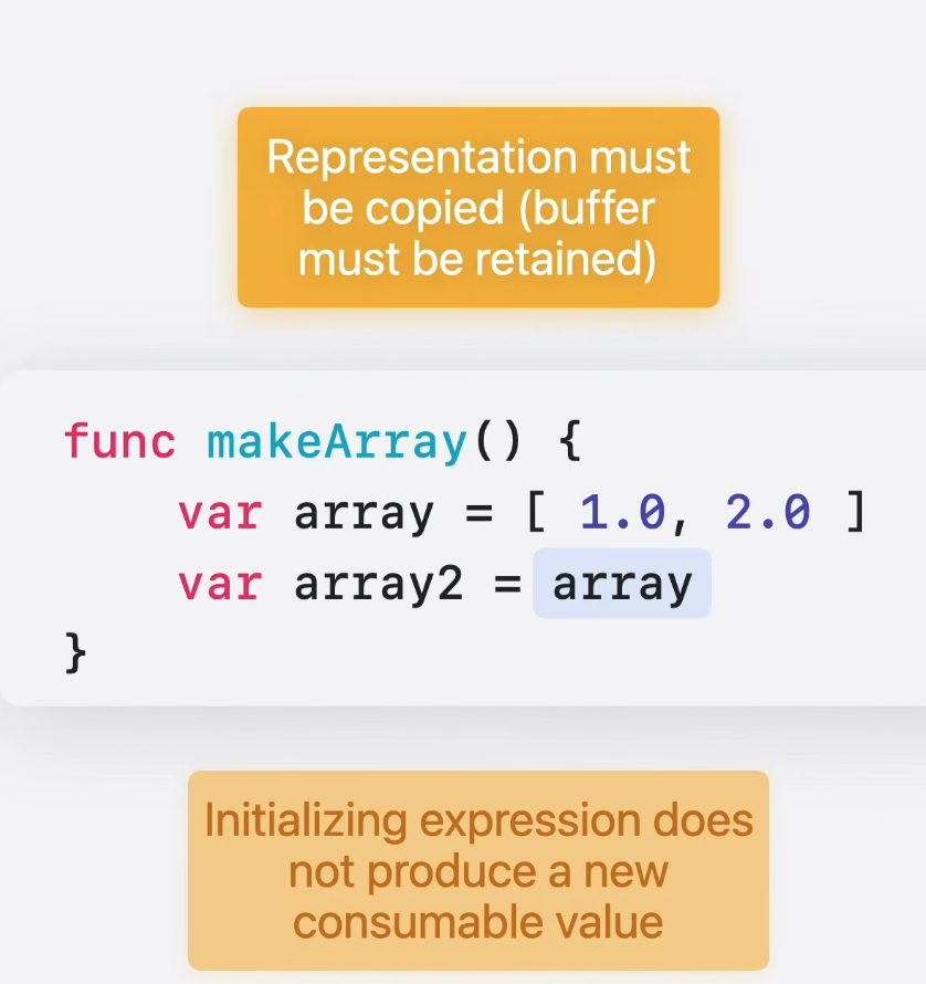 array2에 넣어주면 값은 배열이므로 복사한다는 것은 해당 버퍼를 유지한다는 뜻. 만약 컴파일러가 여기서 array변수가 마지막으로 쓰이고 안쓰인다는 것을 알아? 복사본없이 여기에 값을 전송할 수 있어야 함.