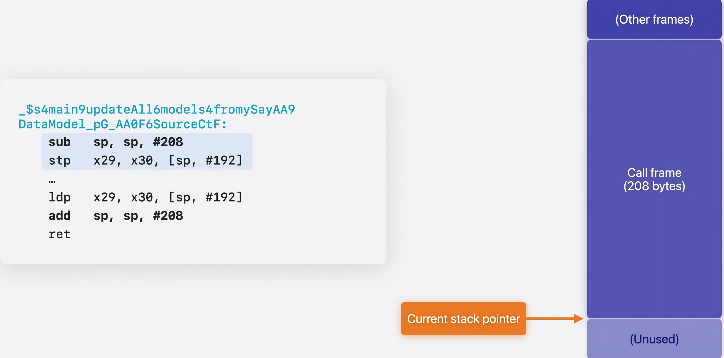 1. 스택 포인터에서 필요한 바이트 수만큼 빼기 (예: 208바이트)