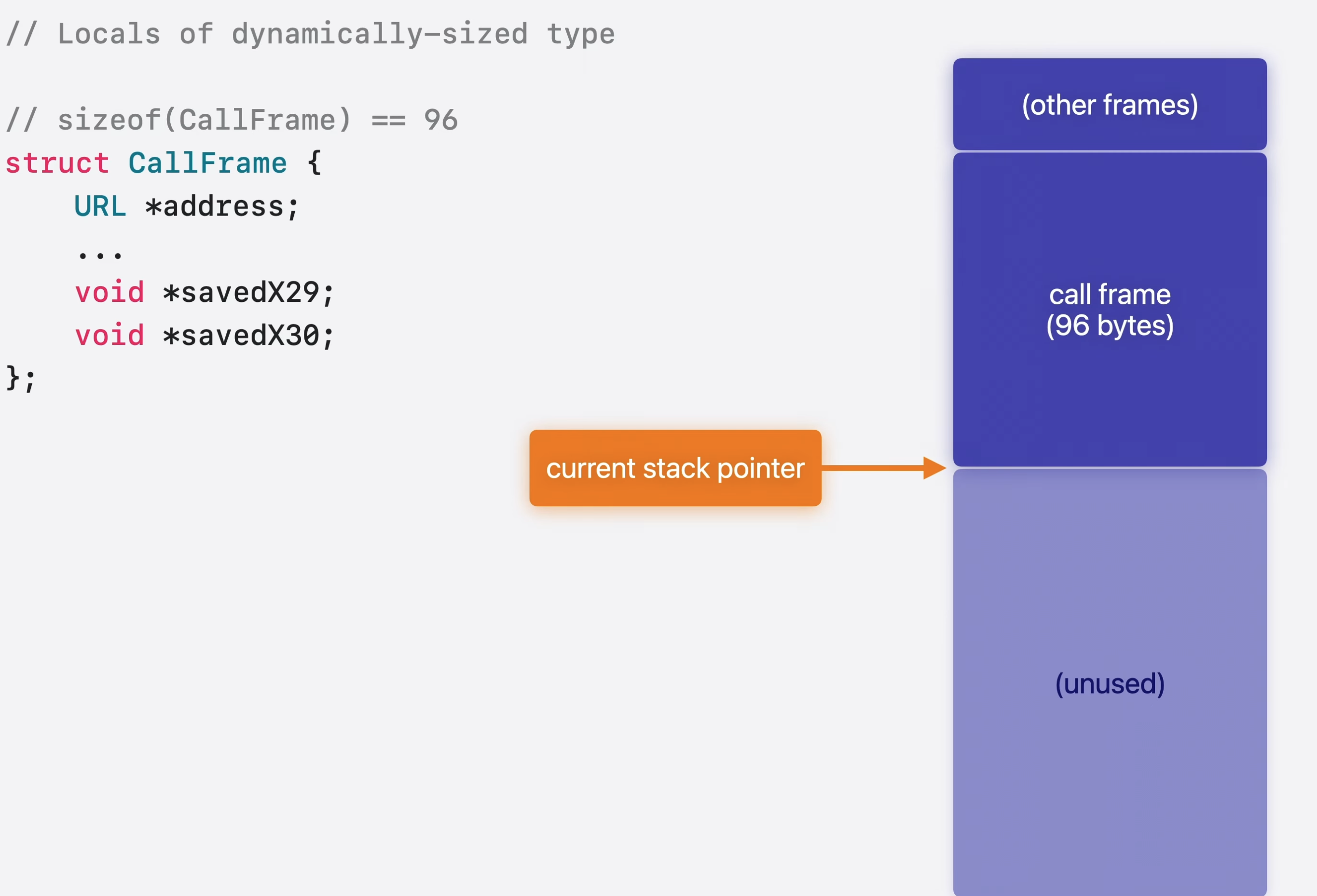 CallFrame은 C 구조체와 유사한 레이아웃을 가지며, 이상적으로는 함수의 모든 로컬 상태가 여기에 포함됩니다.