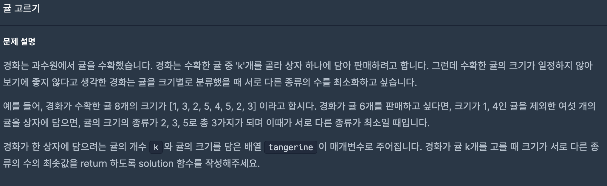 귤의 크기가 최소가 되도록 골라야한다. 그래서 나는 귤이 담겨져있는 tagerine을 먼저 중복을 제거해주었다. 왜냐면 각각의 크기들을 count해주어서 정리를 하려 했는데 겹치는 것들은 해줄 필요가 없기 때문이다. 그 후 for문을 돌면서 각각의 원래의 tangerine에서 개수를 세주어 countarr에 넣어준후 많은것순으로 앞에서부터 정렬해주었다. 그 이유가 많은것들을 위주로 뽑으면 종류를 최소화 할수 있기 때문이다. 그후 k에서 빼주며 k가 0이하가 되면 끝났기에 break걸어주었다.