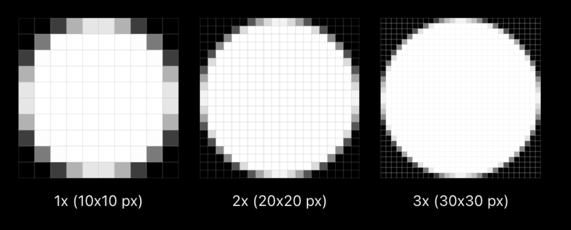HIG문서를 더 보면 1x = 1포인트당 1픽셀을 의미한다. 당연히 고해상도에서는 2:1 또는 3:1 같이 픽셀 밀도가 높다.