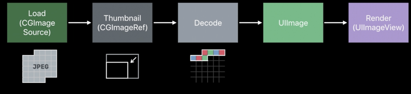 먼저 이미지 소스를 로드하고 썸네일을 만들고 난 후 UIImage에 decoded된 이미지 버퍼를 캡처합니다. 그리고 UIImage를 UIImageView에 할당. 그 후 이미지에 이미 포함되어 있는 databuffer를 제거하여 더 적은 메모리 사용량을 가질 수 있어요.