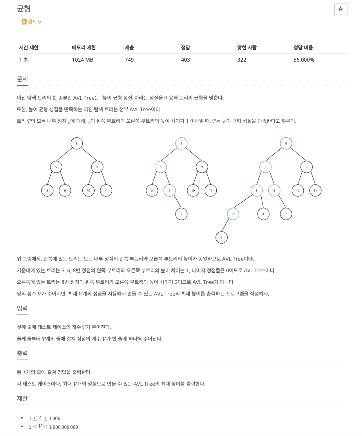 정점의 개수가 주어질때 해당 정점으로 만들수 있는 AVL Tree의 최대 높이를 구하자는 것이다. AVL Tree = 왼쪽과 오른쪽 노드의 층 차이가 1층보다 크면 안됨. 결국 같은 층이거나 1층차이이여만 한다. 맨 오른쪽의 예제를 보면 1과 10이 2층차이난다. 그냥 이렇게 해석하면 끝!