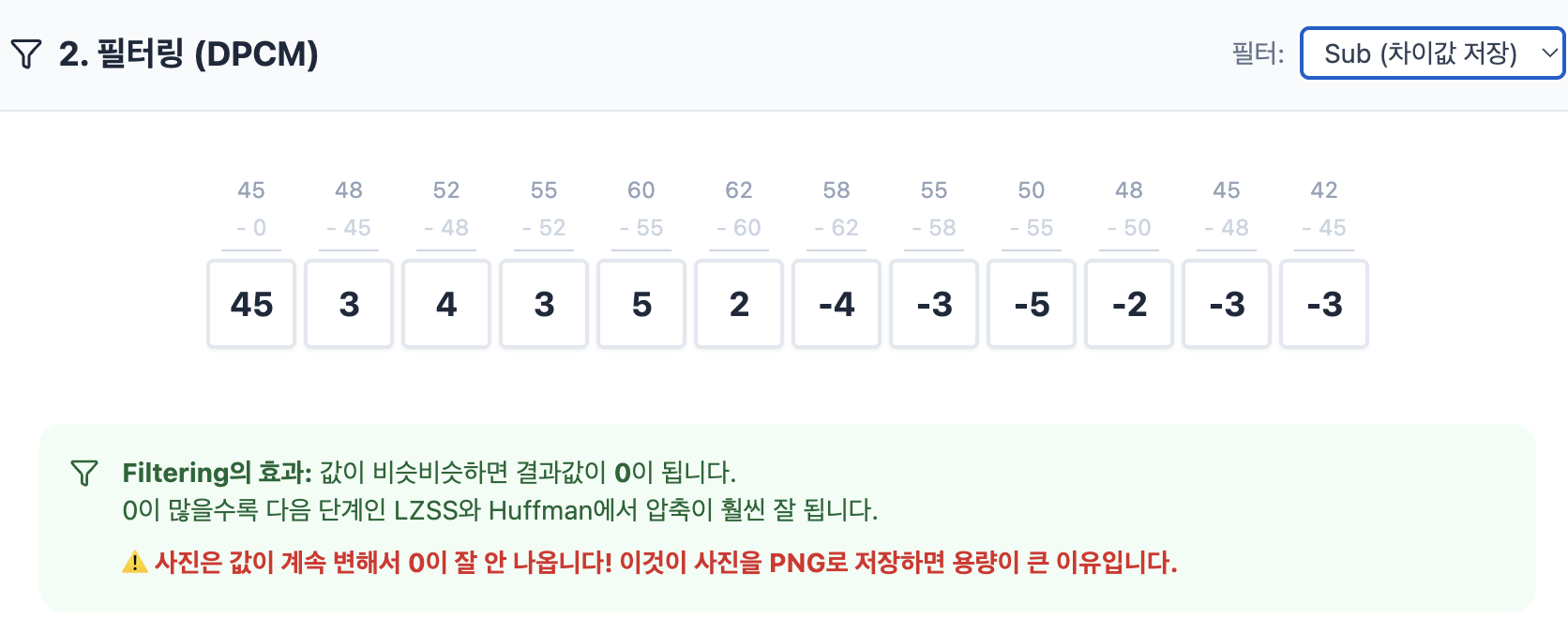 1. 필터링: 각 픽셀 행마다 5가지 필터 중 하나를 적용합니다.