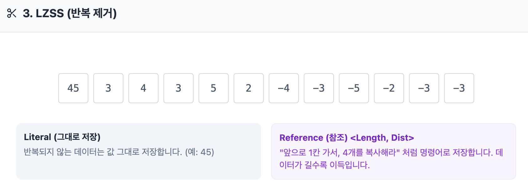 2. LZSS (LZ77 + Sliding Window): 반복되는 패턴을 찾아서 "거리와 길이"로 치환
